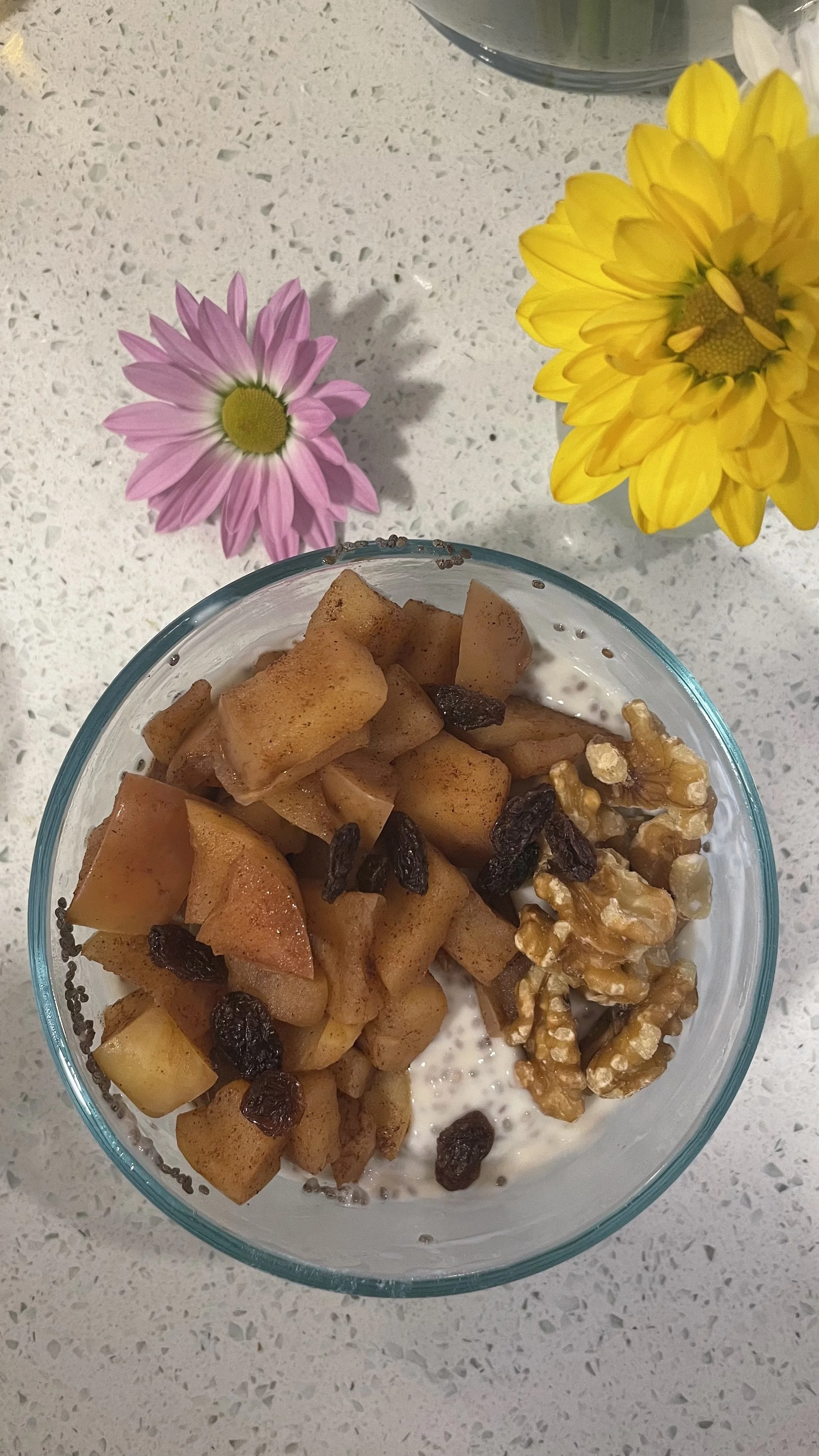 I like keeping a bag of shelled walnuts in the freezer and I top this parfait with a handful of those and a handful of raisins. Be sure to heat up the apples (I microwave for 40 -60 seconds) before adding them on top for extra goodness. Enjoy!
